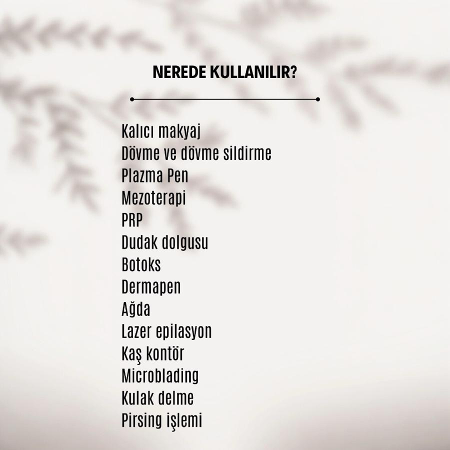 Anestezi Acı Azaltıcı Topikal Krem, lazer epilasyon, kalıcı makyaj, botoks, dolgu, dövme, dövme sildirme, plazma pen, mezoterapi, PRP, dudak dolgusu, dermapen, ağda, kaş kontör, microblading, kulak delme, pirsing gibi acılı işlemlerde kullanılabilen etkili bir üründür. Yüksek etken madde oranı sayesinde uygulama sırasında yaşanan ağrı, rahatsızlık ve acıyı büyük ölçüde azaltır, kullanıcılara rahat bir deneyim sunar.