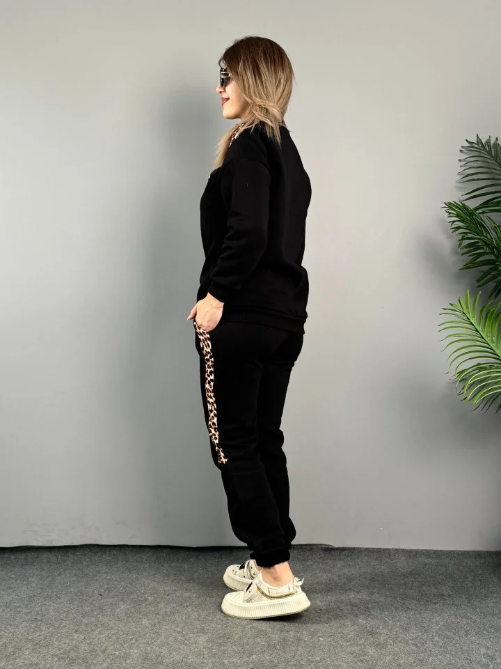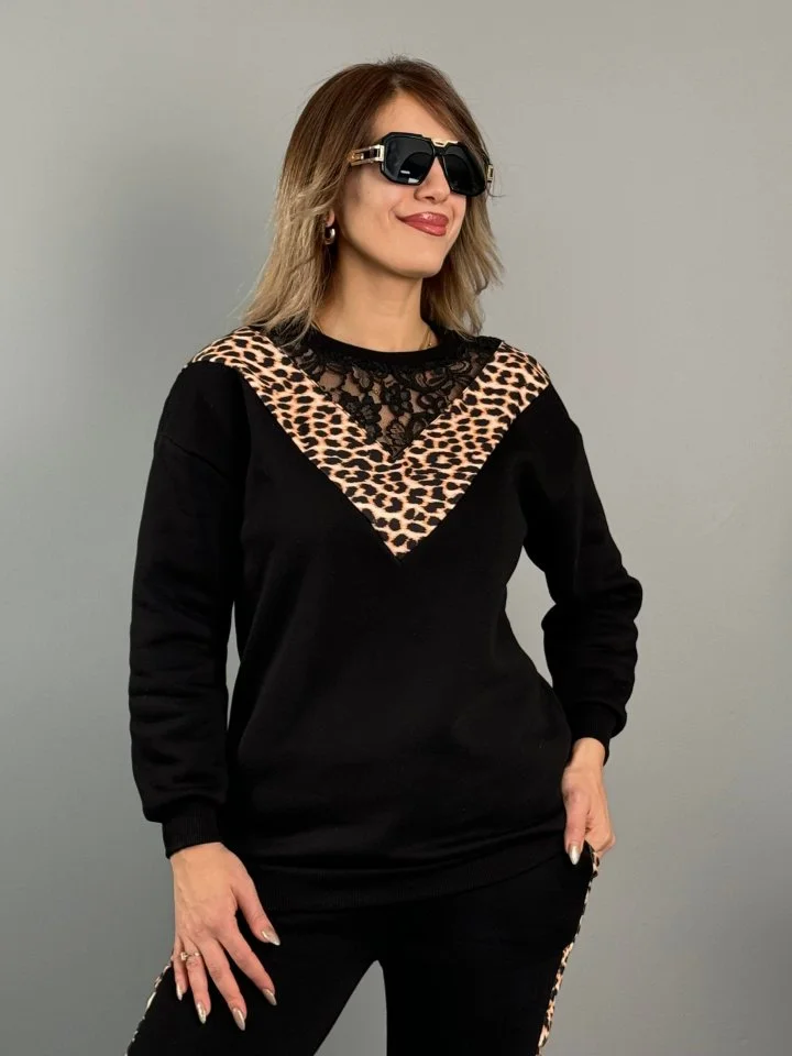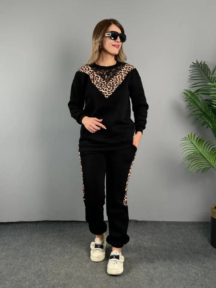 Leopar Desenli Kumaş Dantelli İkili Takım